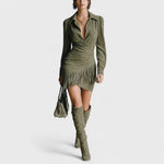 Sukienka Rhea ucieleśnia doskonałą równowagę między elegancją a odwagą. Wykonana z miękkiego zamszu, delikatnie otula kształty ciała, podczas gdy frędzle dodają ruchu i osobowości przy każdym kroku. Strukturalny krój i aksamitna tekstura sprawiają, że ta sukienka jest idealna na specjalne wieczory lub wydarzenia, w których chcesz wyróżniać się stylem i pewnością siebie.