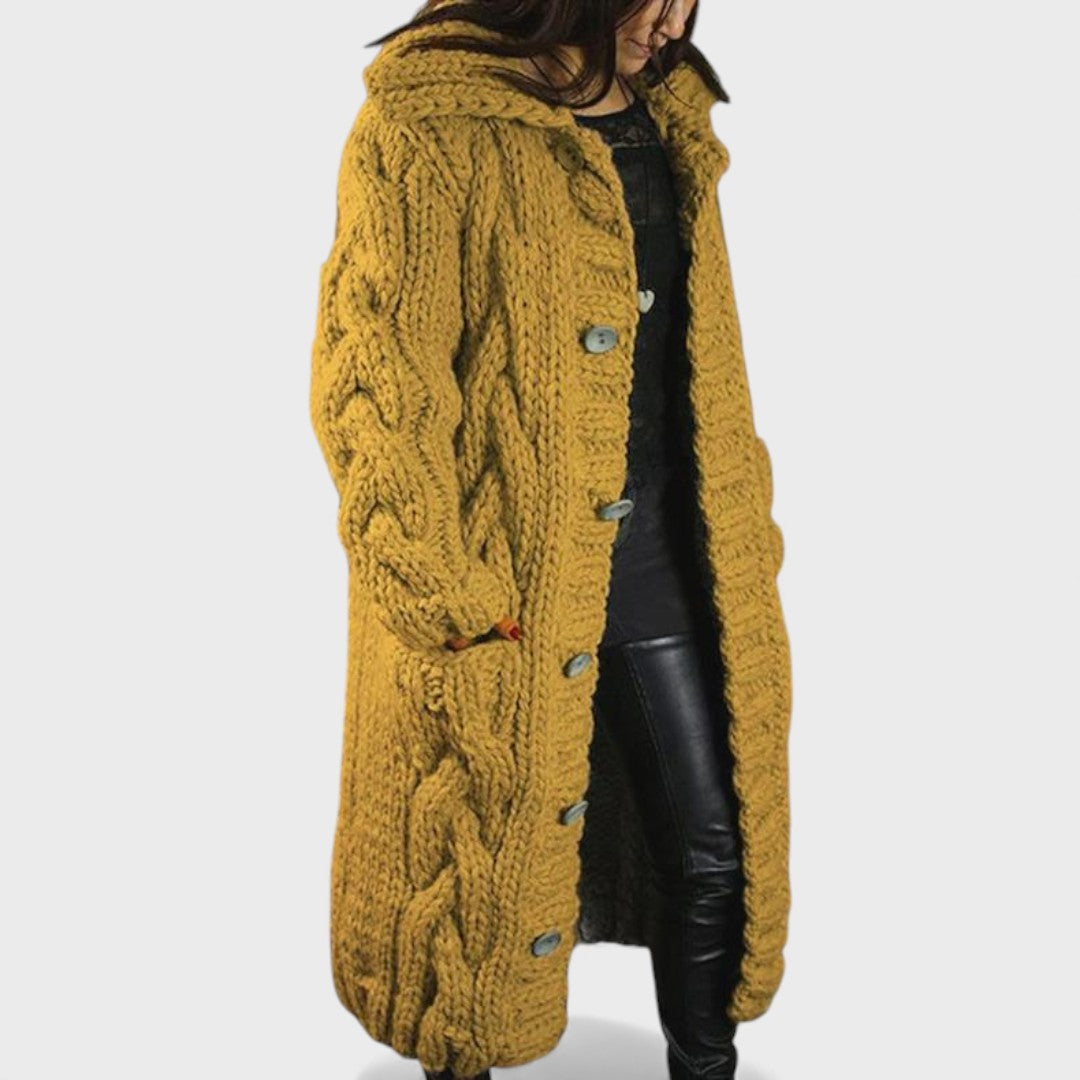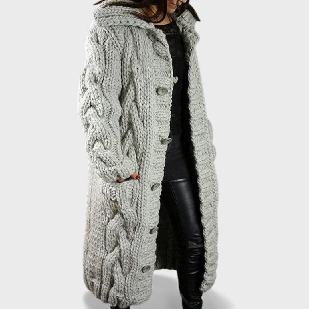 Elegancki i wygodny płaszcz Karina otula Cię ciepłem, fakturą i ponadczasowym stylem. Wykonany z miękkiej i oddychającej mieszanki dzianiny, ma oversize'owy design w warkocze, który dodaje zarówno komfortu, jak i charakteru. Silhouette o pełnej długości oferuje delikatne osłonięcie brzucha oraz eleganckie drapowanie, podczas gdy kaptur i boczne kieszenie zapewniają praktyczną elegancję. Niezależnie od tego, czy wychodzisz na relaksujący spacer, czy spotykasz się z przyjaciółmi, Karina sprawia, że wyglądasz modnie, komfortowo i bez wysiłku elegancko.